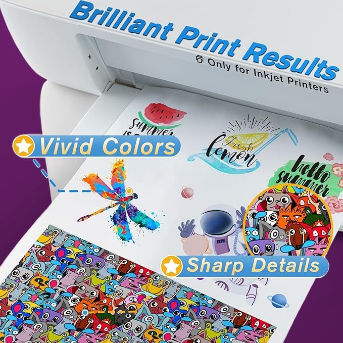 - PRINTER COMPATIBILITY: Works seamlessly with all inkjet printers. Available in A4 size with 10 sheets per pack. Best suited for use on clear or light-colored surfaces.