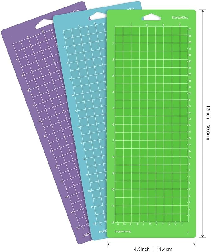 - 3 Pack [ 4.5×12 inch ] INCLUDING [1 Standard Grip Green and Clear] [ 1 Strong Grip Purple ] [1 Light Grip Blue]- for Cricut Joy- Which is great for cardstock, iron-on, vinyl, washi and window cling material. These variety mats for Cricut are perfectly compatible with Cricut Explore Maker machine.